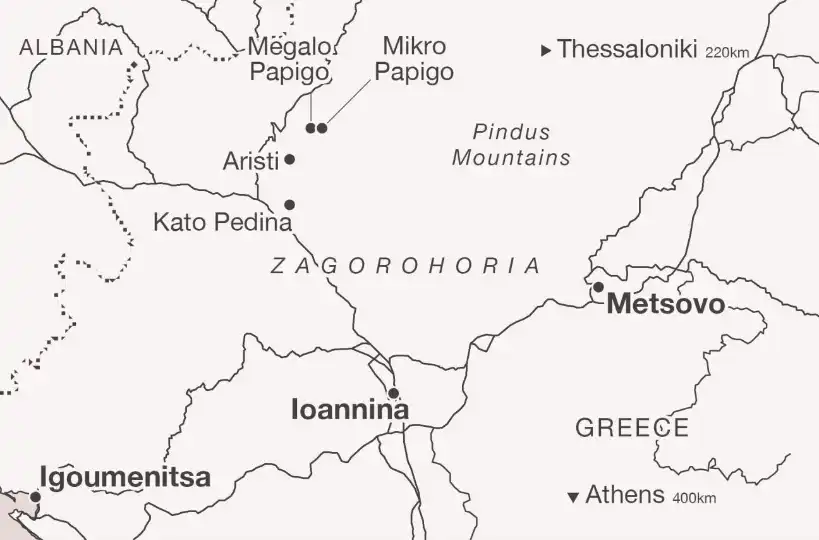 The journey from Athens to Zagorohoria is a scenic five-hour drive. The Mediterranean landscape of scrubland and low-slung trees gives way to expanses of cotton fields, while hills carpeted with rich, green pine forests rise in the distance. At roadside stalls, fruit sellers court the business of passing drivers. “How do you know about Zagorohoria?” asks one stallholder as we choose a bunch of sweet grapes from his display.