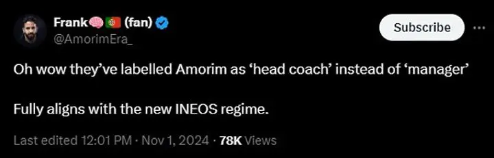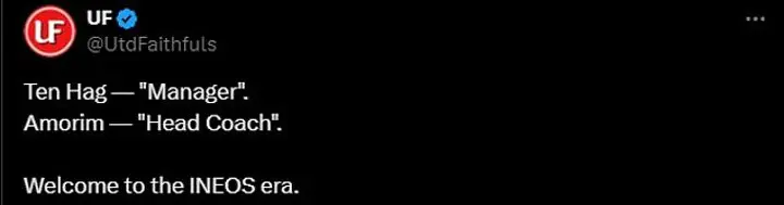 'Oh wow they’ve labelled Amorim as ‘head coach’ instead of ‘manager’ Fully aligns with the new INEOS regime.' One fan wrote on X.