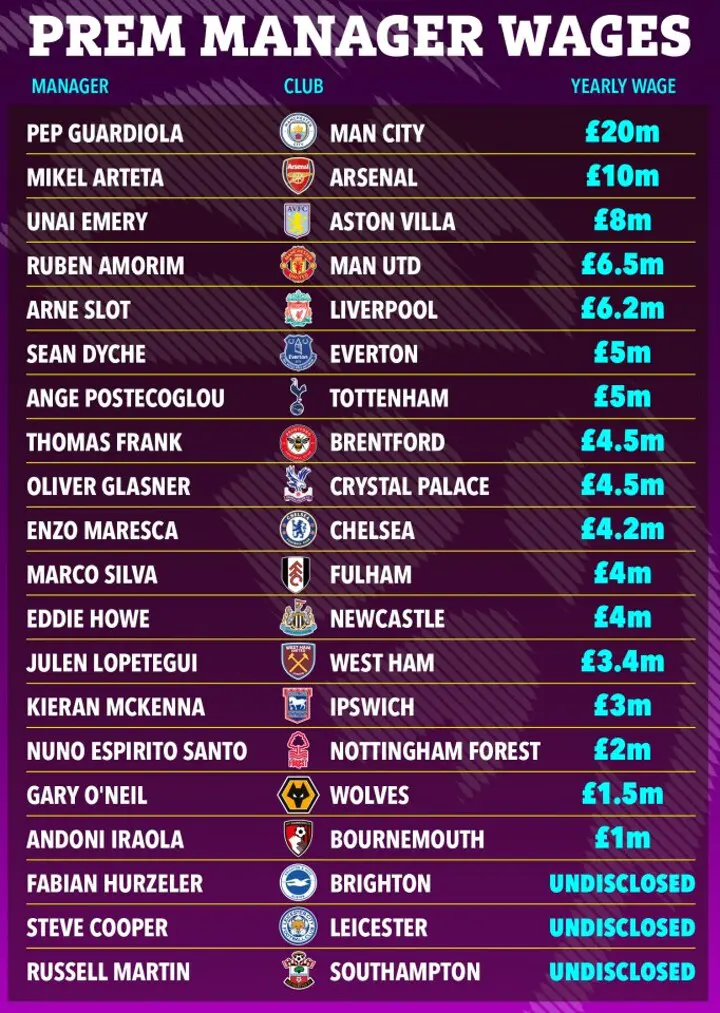 Arsenal manager Mikel Arteta takes home £10m and Aston Villa gaffer Unai Emery is third on £8m.